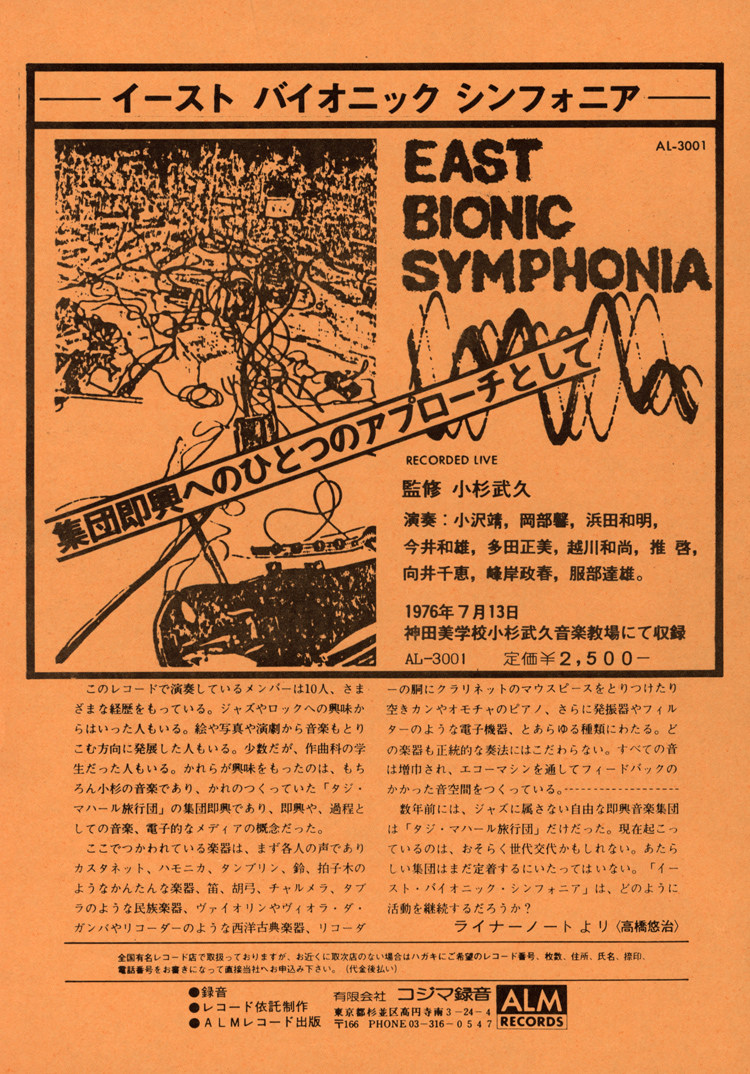 In the review, he drew an interesting parallel with the Art Ensemble of Chicago and with the Black Artists Group in the use of little instruments, notably at the beginning of the A-side, and also with Anthony Braxtion in the odd march tune starting up the B-side. There is something of the genre-breaking habitus of the AACM crowd here, also heard on Izu's "Forgotten Spirits", calling forth the link between the US west coast and the East Asian continent which was eventually to be known as Asian Improv.
